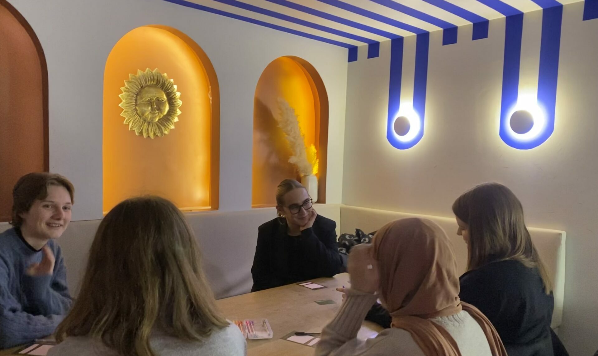 Au Paloma Bar le 26 octobre, cinq participantes partagent un moment d’écoute et de confiance (de gauche à droite : Lola, Selma, Victoria, Amélie et Lilie)