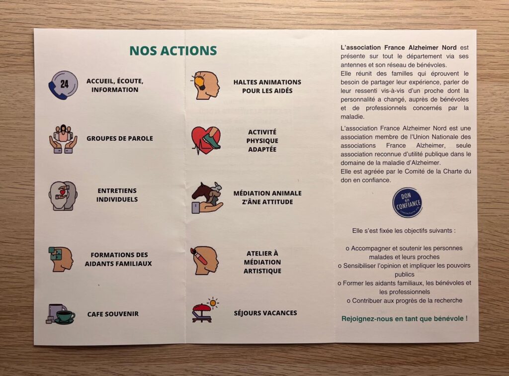 Au-delà des groupes de parole et des formations, France Alzheimer Nord développe des actions destinées à maintenir le lien entre aidants et aidés : activités physiques adaptées, médiation animale en partenariat avec le centre Z’Âne Attitude de Frelinghien, ateliers culturels en partenariat avec le musée de la Piscine de Roubaix et le musée LaM de Villeneuve-d’Ascq, ou encore séjours vacances encadrés. Autant d’initiatives visant à rompre l’isolement et à recréer une continuité dans des parcours médicaux souvent morcelés. Selon Lydia Denis, le succès de l’association auprès des aidants tient du fait que « les institutions appuient sur tout ce que le malade perd. Nous, on montre ce qu’ils peuvent encore faire ».